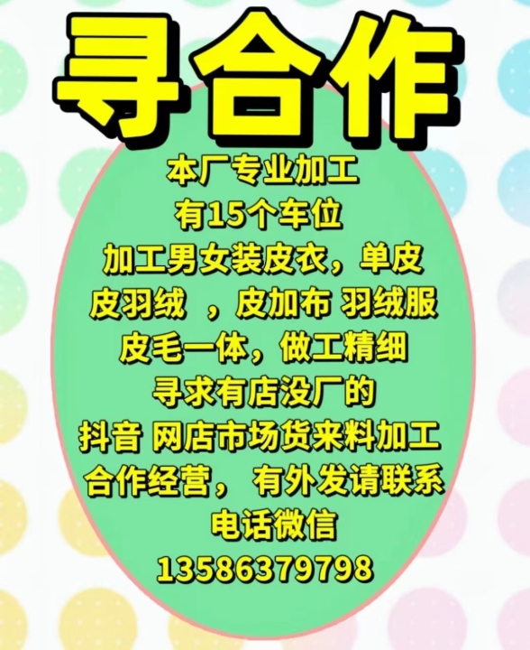 【求合作】皮衣厂有50个车位,可加工皮衣,布衣等可大量生产,量大量少都可...