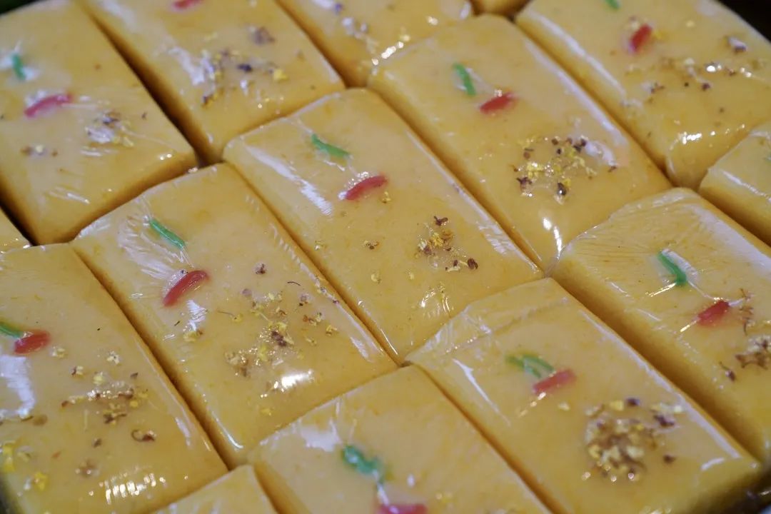 以年糕作为原料,放入少许桂花,将桂花的香和年糕的滑爽糅和到一起。尝一口,年糕糯叽叽的口感,点缀上桂花的清香,再配上一盏温茶同食,是惬意满满的秋天无疑了。