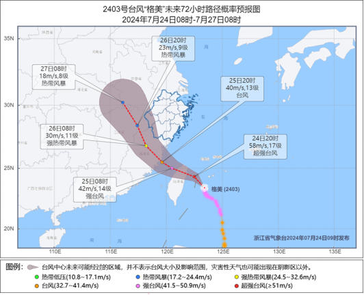 今年第3号台风“格美”今天(24日)上午8点钟由强台风级加强为超强台风级,上午9点钟其中心位于我国台湾省宜兰县东南方大约195公里的洋面上,就是北纬23.6度、东经123.2度,中心附近最大风力有16级(55米/秒),中心最低气压为930百帕,七级风圈半径250-380公里,十级风圈半径100-120公里,十二级风圈半径55-65公里。