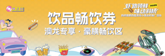 在“王者澳龙”核心区摊位购买澳龙即可获得饮品畅饮券,凭券可在现场啤酒畅饮。