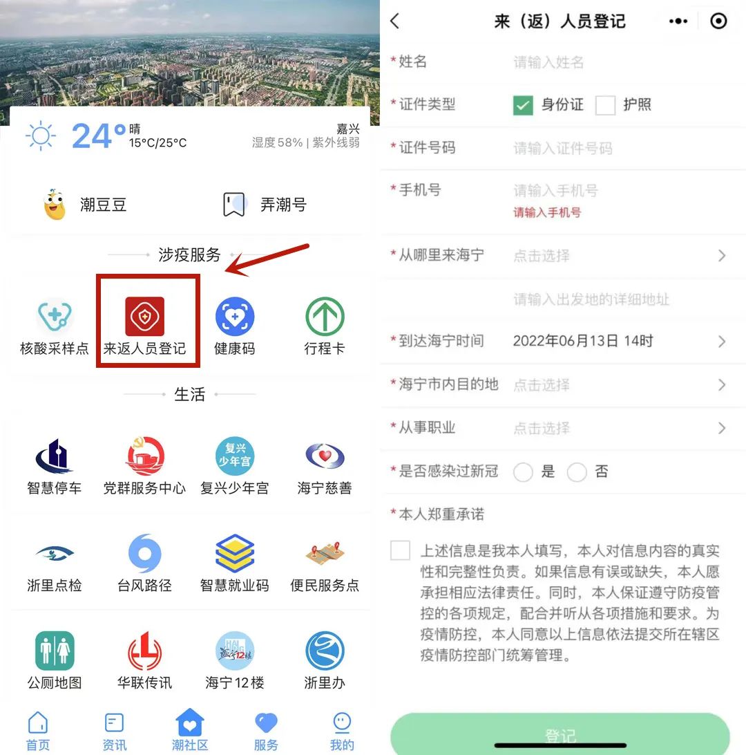 2.严格报备、报告制度。嘉兴市外来(返)海宁人员要严格执行报备制度,提前24小时通过微信小程序“微嘉园”或“海宁通”进行线上报备,也可以选择电话、委托亲人朋友等方式向目的地所在村(社区)报备,如实告知近7天内旅居史。来(返)海宁后要在1小时内向所在村(社区)、单位或入住宾馆(酒店)报告。