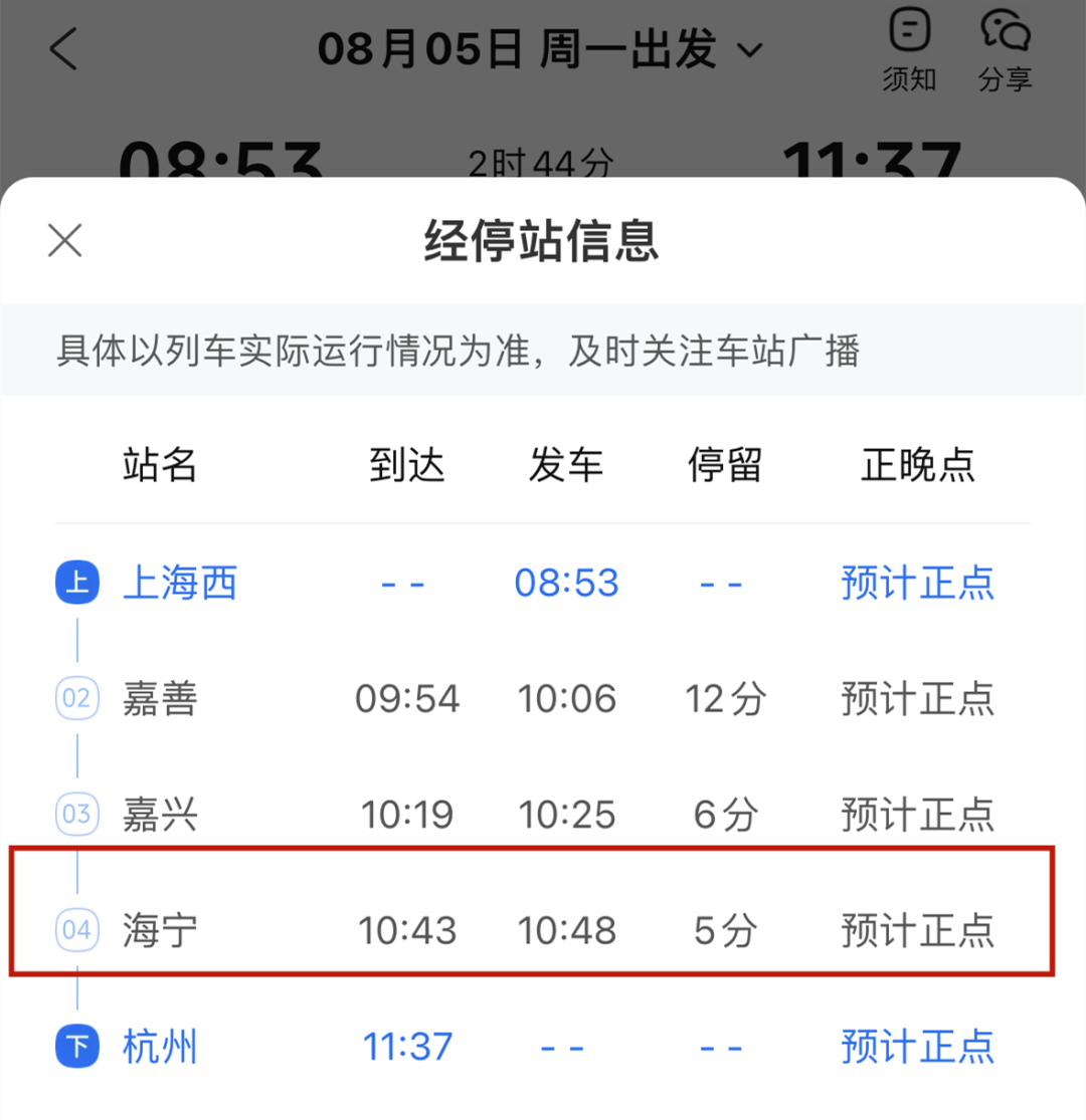 在购票平台上可以看到,海宁站单程票价为21.5元,用时不到2小时。