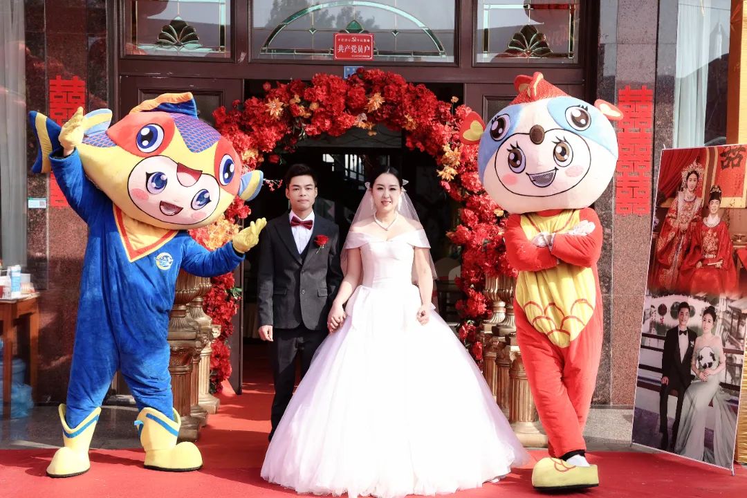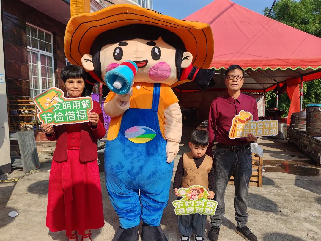 “五里不同风,十里不同俗。”移风易俗也重在“润物无声”的宣传和引导。在婚礼现场上,记者看到姚萍家门口摆上了“共富俭”项目宣传栏和办酒倡议书,餐桌上张贴了各种移风易俗的标语……另外,荡湾村吉祥物锦锦、鳞鳞也来到现场“撑腰”,向宾客们发放宣传单,吸引了许多村民打卡合影。据悉,这些服务已经成为“共富俭”项目的标配。