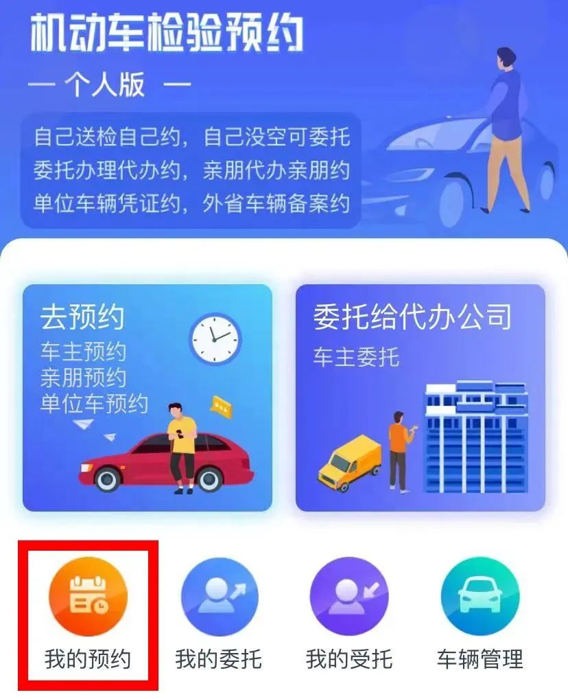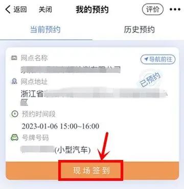 到达检测站后,车主点击“我的预约”(代办公司工作人员点击“我的受托”)——找到预约(受托)车辆后——点击“现场签到”。