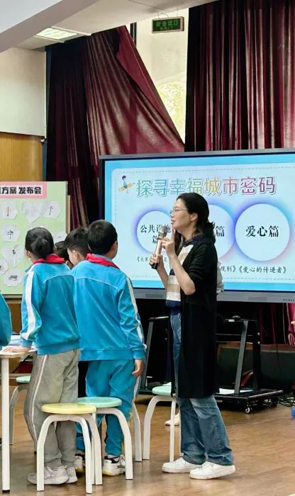 张梦洁授课的课题是道德与法治三年级下册第8课《大家的“朋友”》。张梦洁从教材单元整体视角出发,引导学生聚焦“公共生活”,创设“成立幸福城市观察团,探寻幸福密码”这一单元大情境,激发学生的学习兴趣。