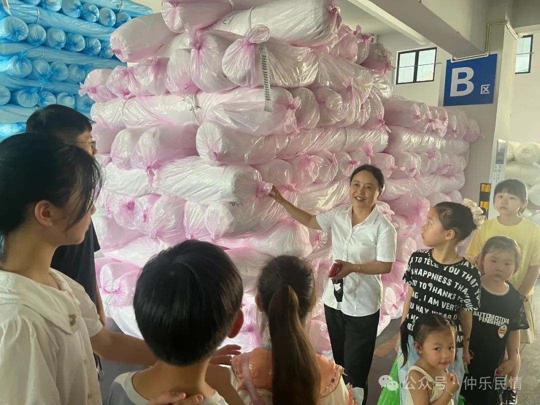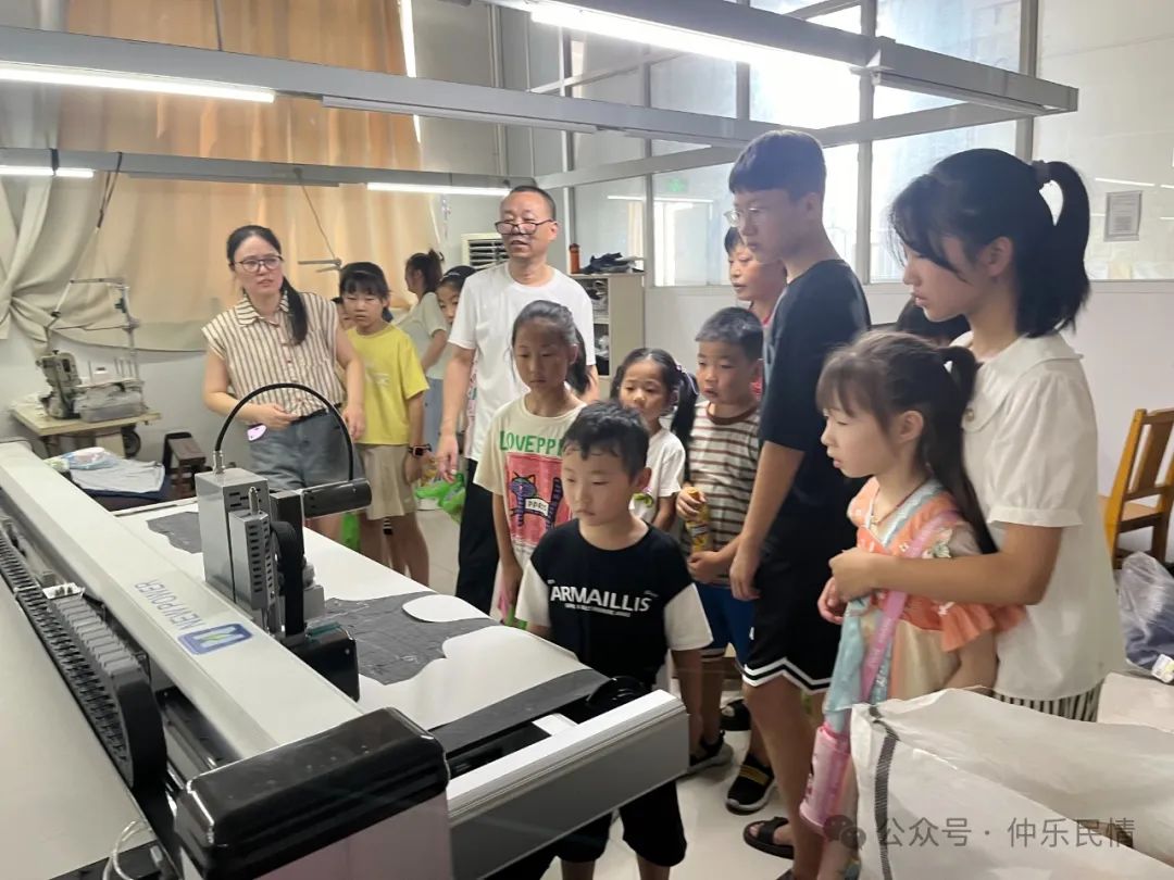 首先,仲乐村工作人员带领青少年们来到海宁市华亿经编有限公司。公司工作人员带大家参观了样品车间,向大家展示和介绍了各种颜色和各种用途的面料,这些面料都畅销海内外,后大家参观了生产车间,让青少年们体验到从设计、织造、印染等众多生产活动,体验了新型织造技艺,传承了传统织造文明。