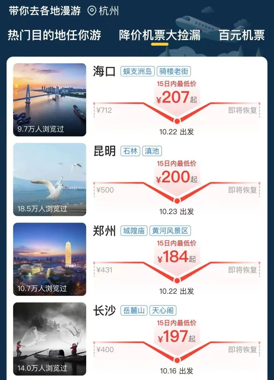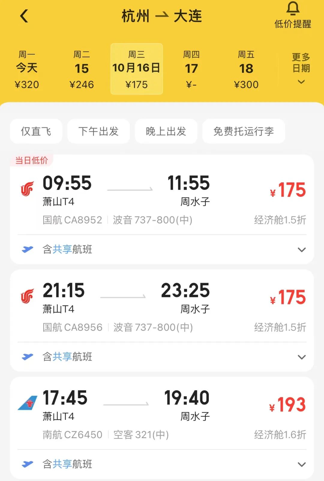 10月16日杭州飞大连,最低票价仅需175元(不含税),大潮君暑假的时候也去了一趟大连,要知道当时机票价格需要六七百元呢。