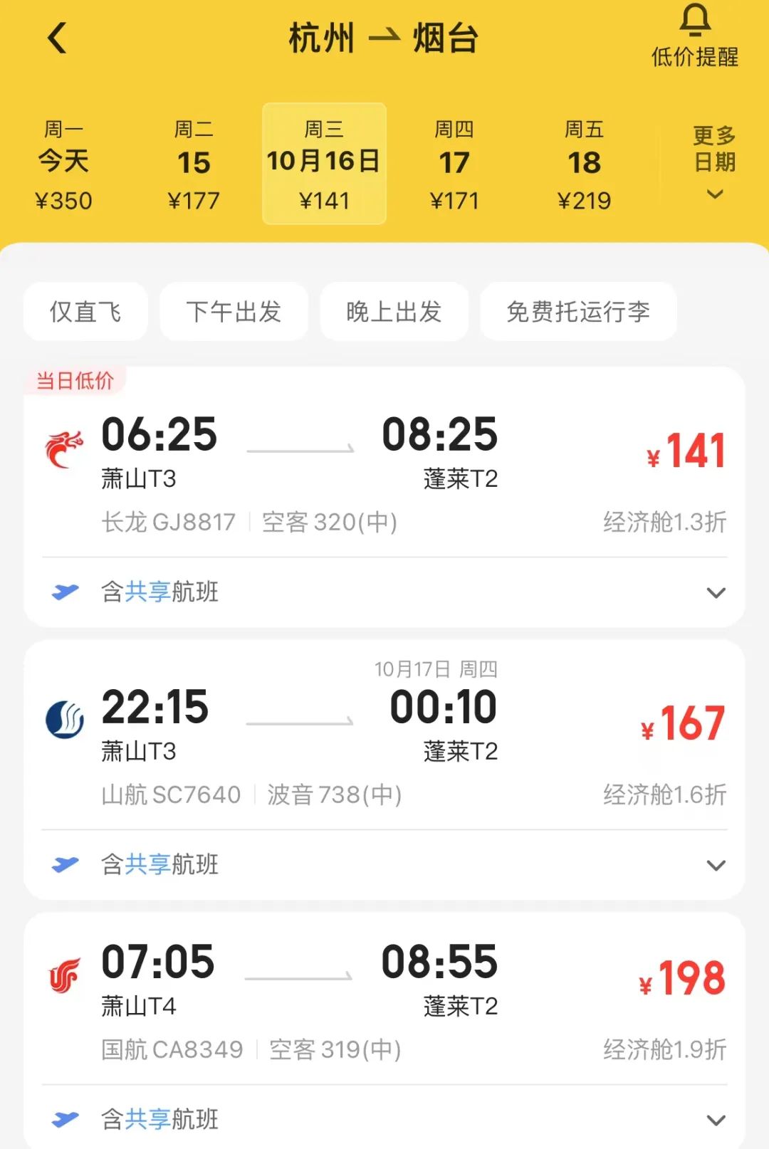 比如,10月16日杭州飞烟台,最低票价只要141元(不含税)。