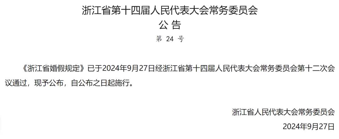 13天婚假生效日以《浙江省婚假规定》公布时间(2024年9月27日)为准,法律规定公布即生效,浙江省人社厅回应:“无论人社部门是否下发文件,都不影响法律生效时间。企业应按照最新的婚假法律法规执行,无需等人社相关文件下发。”