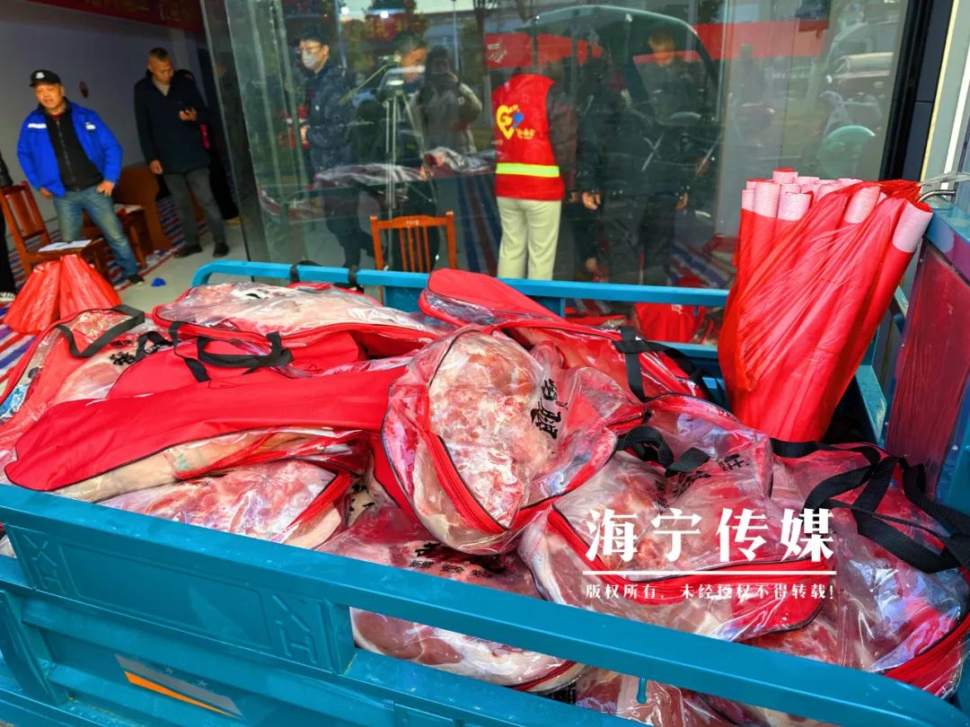 分发现场,横山社区工作人员早早将猪肉按居民小组整齐排列,这些猪肉均由养殖基地前一天宰杀并妥善分装,装于半透明的红色手提袋中,既展示了猪肉的新鲜品质,又增添了几分喜庆色彩。