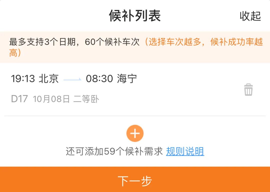 候补列表展示已选候补车次和席别,点击“下一步”进入确认候补订单页面。